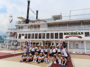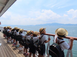 うめ(年長)組のお友だちが、琵琶湖で大型遊覧船『ミシガン』に乗船しました!手を挙げて選ばれたお友だちが力強くドラを鳴らすと、楽しいクルーズの始まりです☆