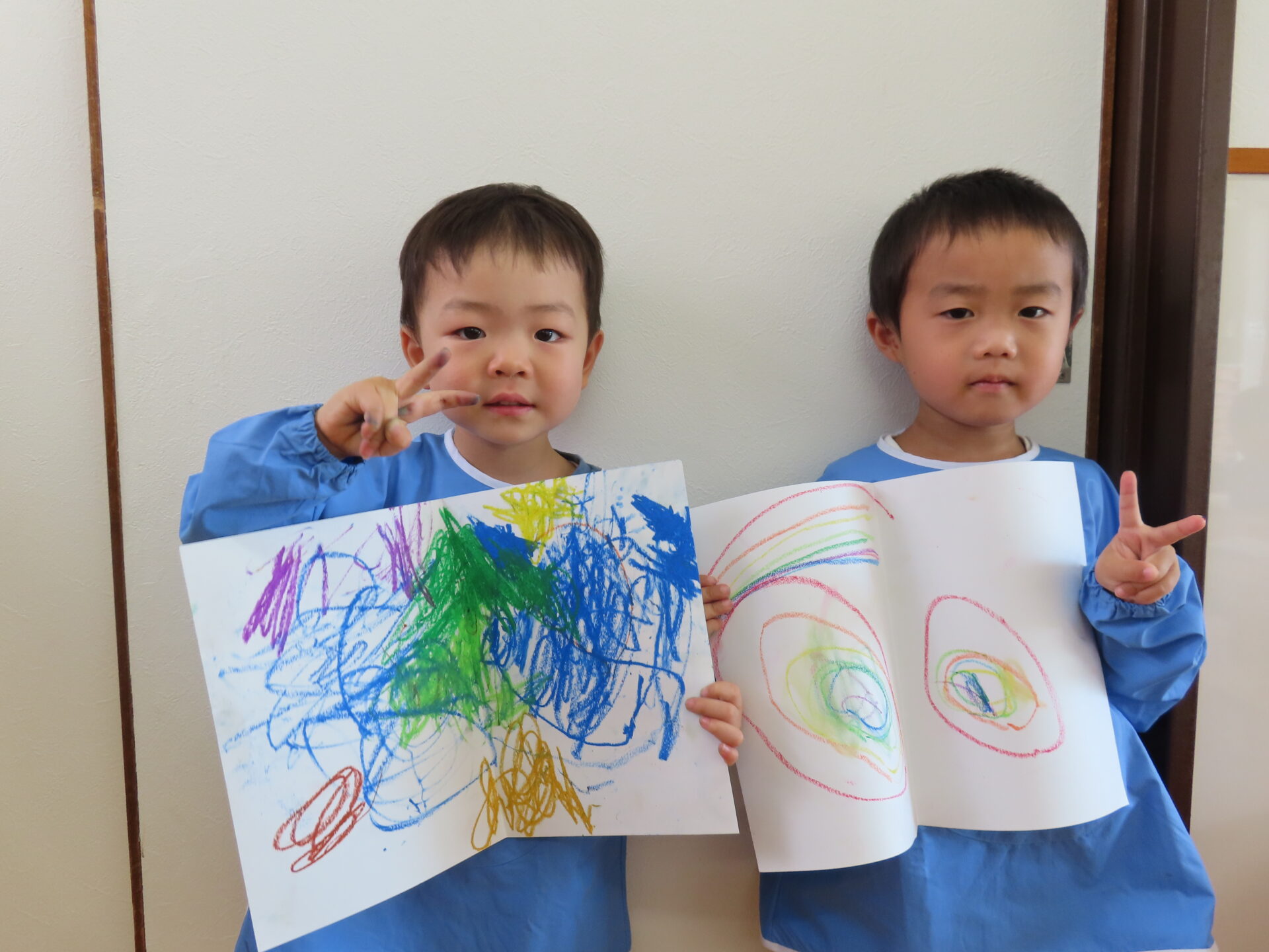 さくら(年少)組のお友だちが『冷蔵庫の中』の絵を描きました。先生が「みんなのお家の冷蔵庫には何が入ってるかな?」と聞くと、「お野菜!」「牛乳も入ってた!」とお話ししていたみんな☆魚や果物などの好きな食べ物を描いていましたよ♪