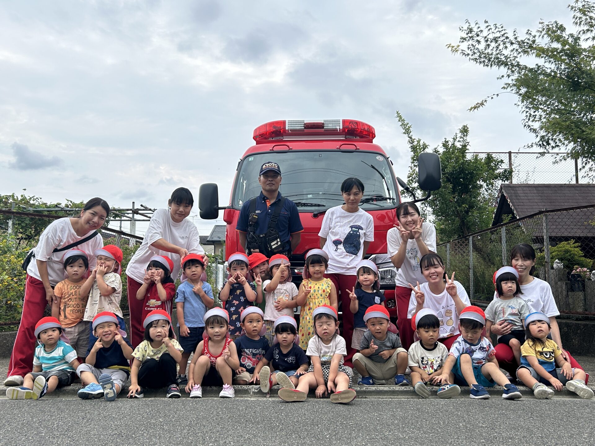 そして、待ちに待った消防車見学!記念撮影をしたり、消防士さんと一緒に消防車の隅々まで見て回っていたみんな!「ホースは何本乗っていますか?」「消防車は何人乗りですか?」「タイヤは何個ついていますか?」と質問をすると、「消防車は荷物がたくさん載っているからタイヤは6個ついているよ!」と教えてもらいました☆