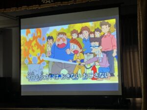 続いて、ゆり(年中)、うめ(年長)組のお友だちは、ホールで火事についてのDVDを鑑賞し、『子どもたちだけで火遊びをしないこと』を学びました!防火服も着させていただき、子どもたちは大満足でした♪