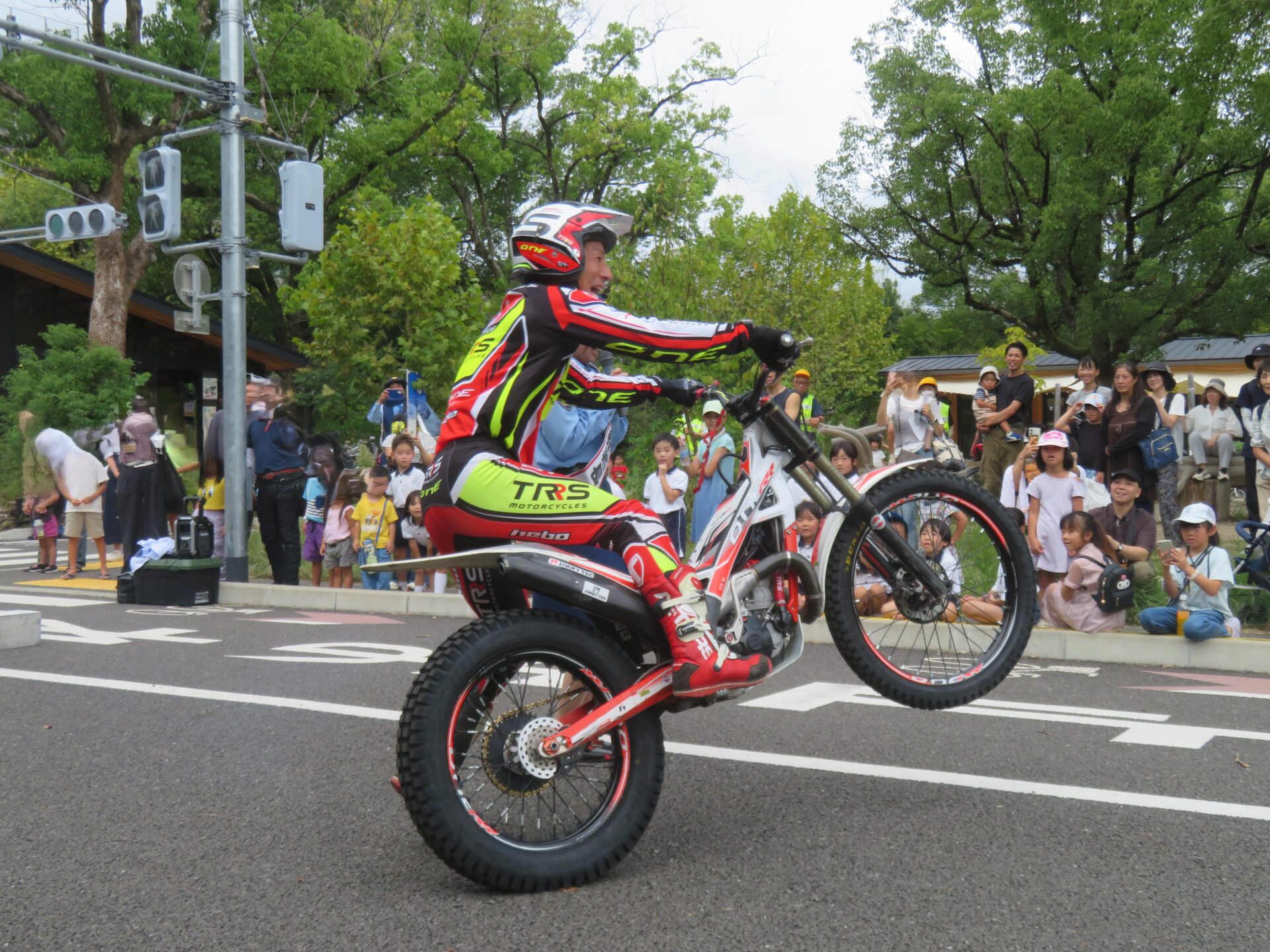 『秋の全国交通安全運動』のイベントの一つとして北警察署主催のスタート式が大宮交通公園で行われ、うめ(年長)組のお友だちがお歌をうたいました。京都府警察オリジナル曲の『交通安全サンバ ~とどけ!手のひらあいず~』をノリノリで踊り、その後『ありがとうの花』と『まほうのとびら』をうたいました。たくさんのお客さまから拍手をもらって大喜びのみんな☆トライアルバイク選手によるデモンストレーション走行では、迫力ある技を間近で見ることができ子どもたちも感動していました☆