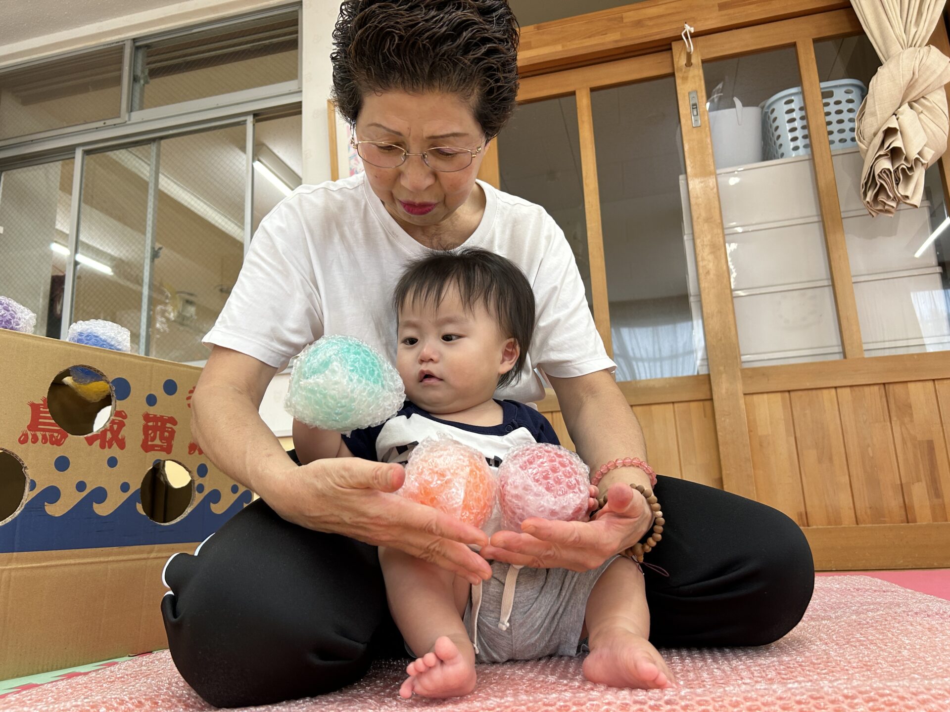 たんぽぽ1組(0歳児)のお友だちが、プチプチシート(気泡緩衝材)で遊びました。カラーボールやマットにプチプチシートを巻き付けると『なんだろう?』と不思議そうに触っていたみんな。「プチッ」と音が鳴るとびっくりした表情をするお友だちもいましたが、だんだん楽しくなってきたのか何度も押してみたり、踏んだりして感触を楽しんでいました♪